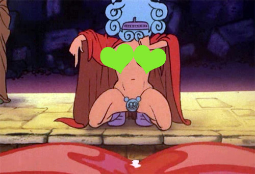 Along the lines of music, I noticed something else, too. In “Den,” one of the film’s vignettes, a bare-chested barbarian dude must rescue a soon-to-be-sacrificed maiden from an evil cult. The ceremony is led by an evil queen — also bare-chested, of course — and her outfit get-up has a familiar-looking symbol blocking the view of her hoohah.